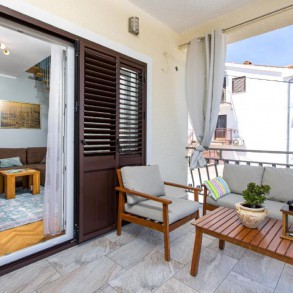 Insel Krk, Malinska, weitere Umgebung, möblierte zweistöckige Wohnung mit 98 m2 Fläche zu verkaufen, mit angelegtem Garten von 81 m2 und Meerblick, in attraktive Lage, 100 m vom Strand entfernt. Die Wohnung besteht aus ersten Stock mit zwei Schlafzimmern, Wohnzimmer, Küche, Essbereich, Badezimmer, Flur, Treppenhaus, zwei überdachten Terrassen von 12,27 m2 und 4,27 m2 und Mansarde mit zwei Schlafzimmern, zwei Badezimmern und Balkon. Hochwertige Konstruktion und Ausstattung, Klimaanlage, Parkplatz 17 m2, drei Abstellräume.